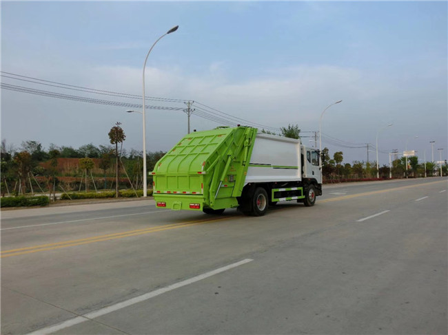 壓縮垃圾車上裝配置:新款平面弧形廂體,廂體材料為武鋼優(yōu)質(zhì)碳鋼,有效壓縮容積10-12立方,PLC一鍵操作控制,手電一體操作模式,兩側(cè)雙電控,帶駕駛室內(nèi)操作,底板支撐加強(qiáng),雙向壓縮,開放式易清潔污水箱。壓縮式垃圾車采用機(jī)電液一體化技術(shù),借助機(jī)、電、液聯(lián)合自動控制系統(tǒng)、電腦控制、手動操作系統(tǒng),通過填裝器和推鏟等專用裝置,實(shí)現(xiàn)垃圾倒入、壓碎或壓扁、強(qiáng)力裝填,把垃圾擠入車廂并壓實(shí)和推卸,污水全部進(jìn)入污水收集箱,解決了垃圾運(yùn)輸過程中的二次污染的問題。壓縮式垃圾車具有自動反復(fù)壓縮以及蠕動壓縮功能,壓縮比高、密封性好、裝載量大﹑操作方便、環(huán)保性好﹑整車?yán)霉β矢叩葍?yōu)點(diǎn)。作業(yè)自動化,垃圾收集方式簡便、高效。后翻轉(zhuǎn)機(jī)構(gòu)選裝:1、掛塑料桶式翻轉(zhuǎn)機(jī)構(gòu);2、掛鐵桶式翻轉(zhuǎn)機(jī)構(gòu);3、擺臂式翻轉(zhuǎn)機(jī)構(gòu); 4、簸箕斗式翻轉(zhuǎn)機(jī)構(gòu)。壓縮垃圾車后部尾部可選裝配置帶筒(或斗)的翻轉(zhuǎn)機(jī)構(gòu),吊裝多容量的桶,240L塑料桶、300L鐵桶、800L小斗、360L塑料桶等。