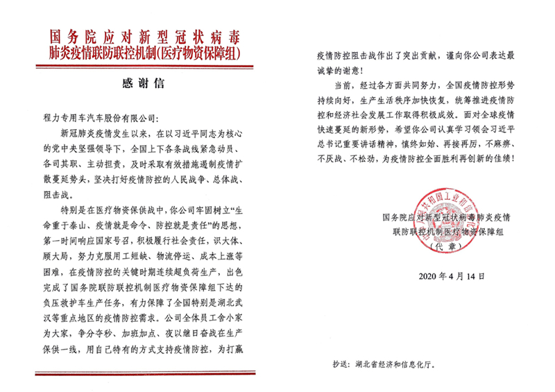 特別是在醫(yī)療物資保供戰(zhàn)中,你公司牢固樹立“生命重于秦山、疫情就是命令、防控就是責(zé)任”的思想,第一時間響應(yīng)國家號召,積極履行社會責(zé)任,識大體、顧大局,努力克服用工短缺、物流停運、成本上漲等困難,在疫情防控的關(guān)鍵時期連續(xù)超負(fù)荷生產(chǎn),出色完成了國務(wù)院聯(lián)防聯(lián)控機(jī)制醫(yī)療物資保障組下達(dá)的負(fù)壓救護(hù)車生產(chǎn)任務(wù),有力保障了全國特別是湖北武漢等重點地區(qū)的疫情防控需求。公司全體員工舍小家為大家,爭分奪秒、加班加點、夜以繼日奮戰(zhàn)在生產(chǎn)保供一線,用自己特有的方式支持疫情防控,為打贏疫情防控阻擊戰(zhàn)作出了突出貢獻(xiàn),謹(jǐn)向你公司表達(dá)最誠摯的謝意!