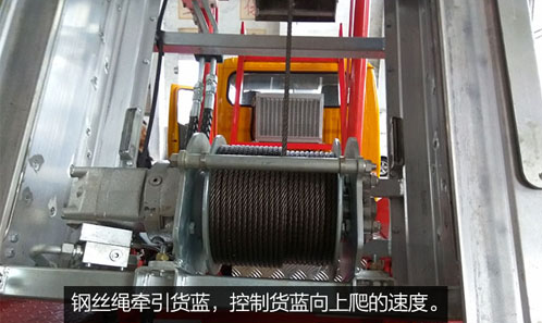 鋼絲繩牽引貨斗,控制貨斗向上爬/回落的速度。